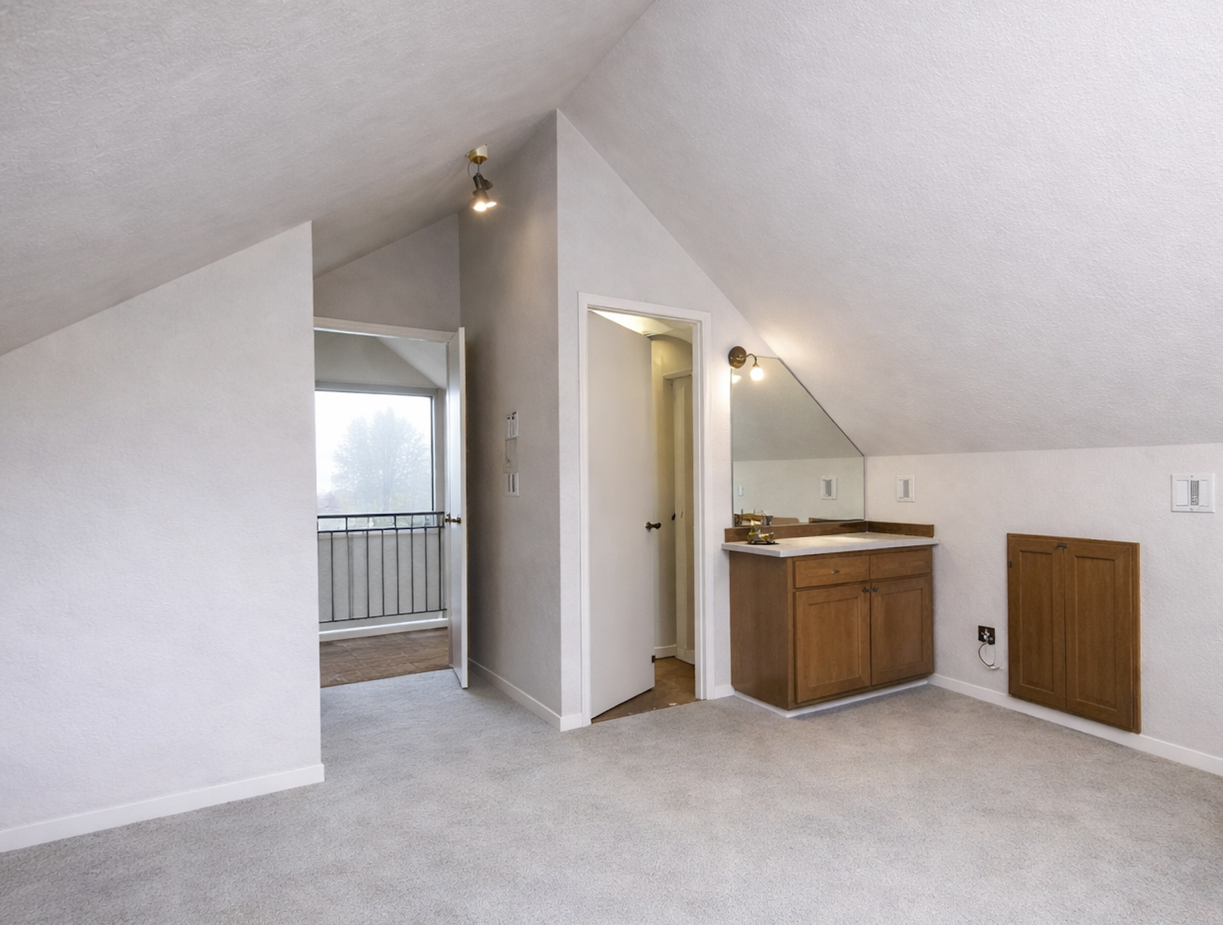 A mini-split system was framed and installed above the relocated inner door to provide necessary cooling for this third-floor space, where temperature control was essential for comfort. Installation required careful routing of refrigerant and condensate lines through the attic and out the exterior wall, allowing for effective climate control while maintaining a clean, integrated finish.