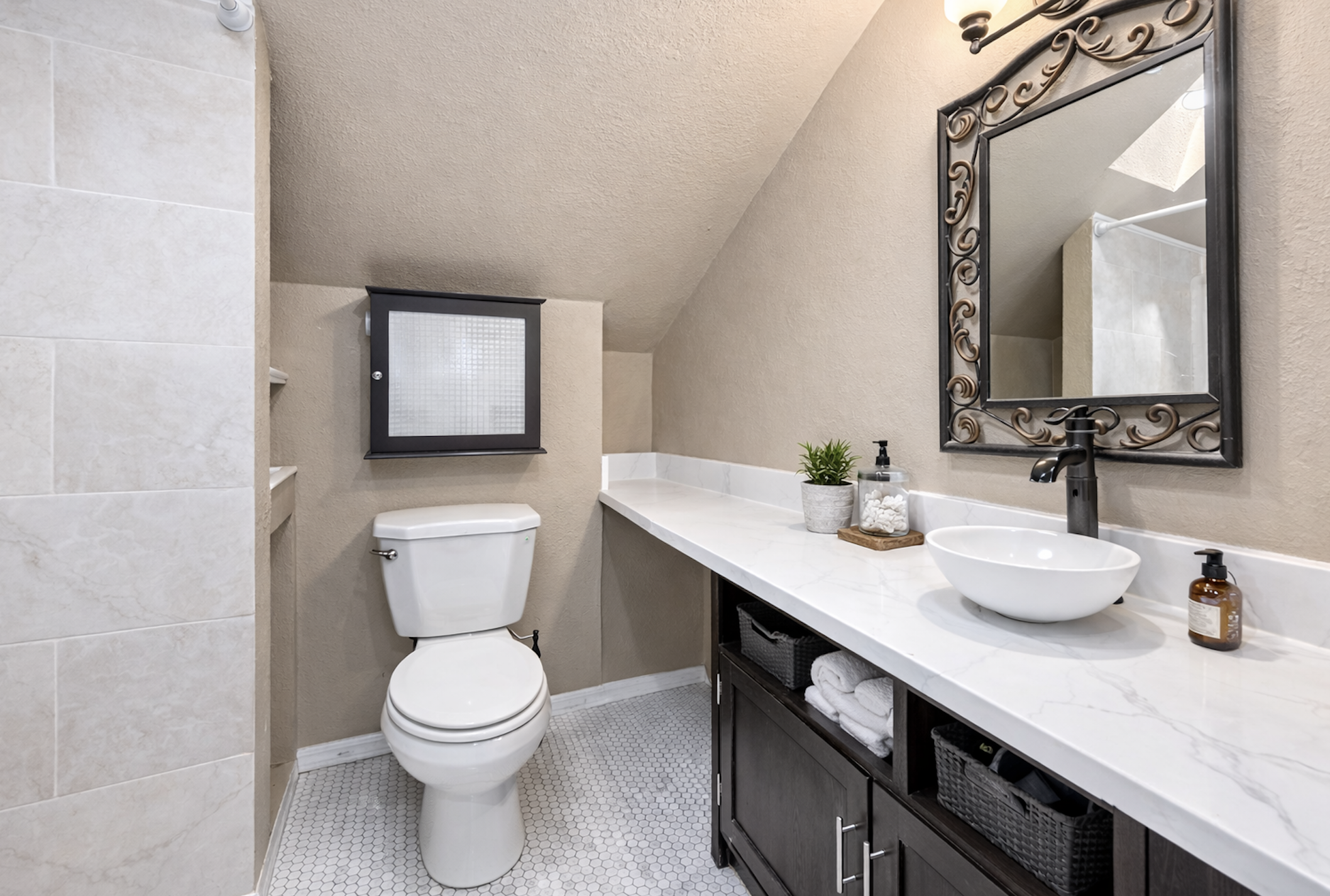 Wall was relocated to fully incorporate sink, cabinetry, plumbing, and electrical within the bathroom envelope. Framing, rough-in relocation, and finish coordination were completed to improve functionality and spatial flow. New flooring was installed throughout the space, and a sliding farmhouse-style door was added at the owner's request.